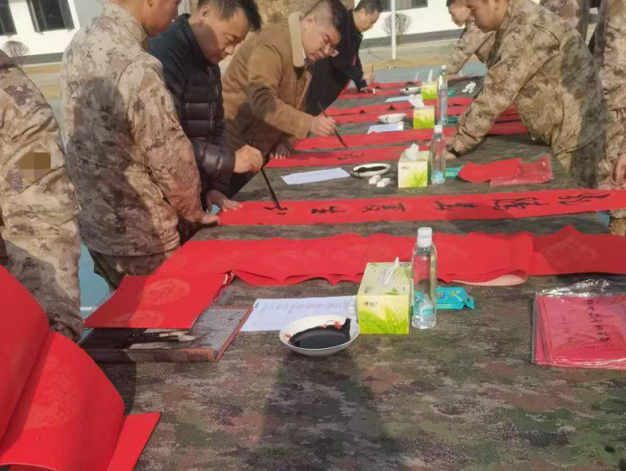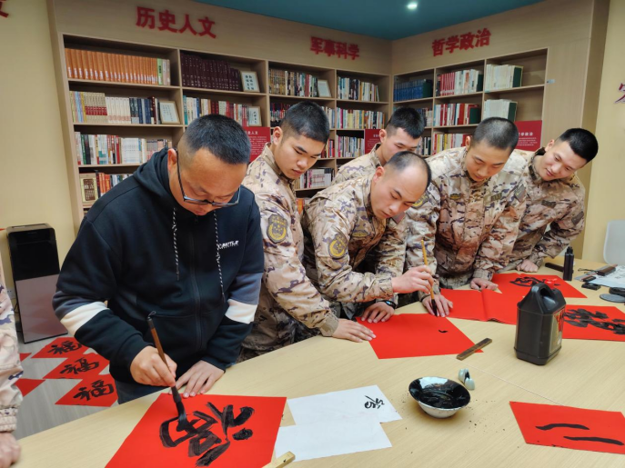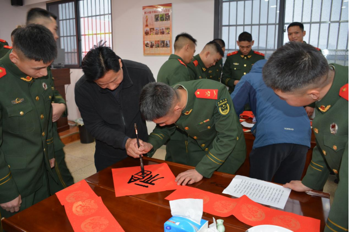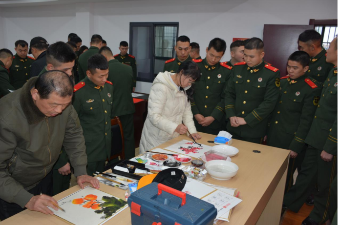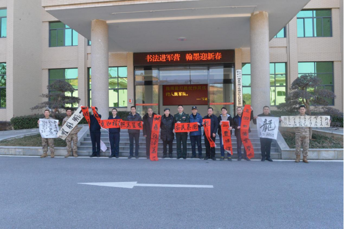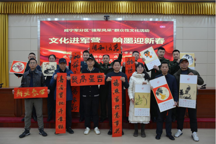 1月23日,农历小年,咸宁市双拥办联合市文联、市书法家协会、市美术家协会,走进咸宁军分区、武警咸宁支队某部开展“文化进军营 翰墨迎新春”活动,为部队官兵们带去了一场精彩纷呈的中华传统文化书法和绘画盛宴,让人民子弟兵在浓浓的墨香与真挚的关怀中,提前感受到春节的喜庆氛围。