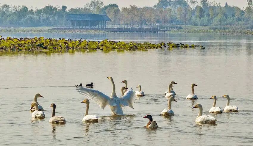 当阳市季家湖湿地公园迎来一群“老朋友”,国家二级保护动物小天鹅在波光粼粼的湖面成群结队地游动