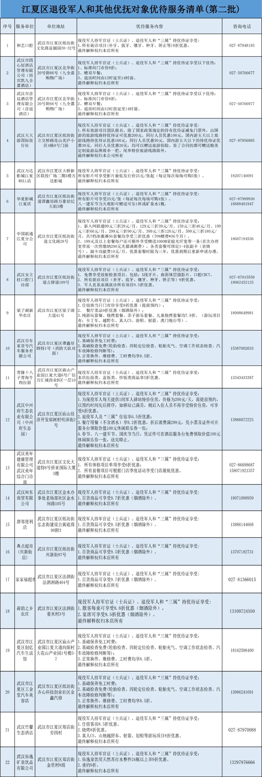 10月30日,武汉市江夏区退役军人事务局为全区22家“拥军优抚服务单位”挂牌。即日起,为现役军人、退役军人和其他优抚对象推出医疗、通讯、旅游、购物、餐饮、住宿等专属优待服务项目清单。