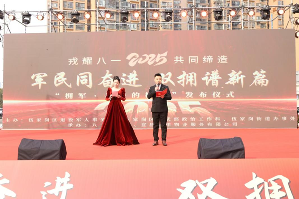 1月10日,“军民同奋进 双拥谱新篇”双拥文艺汇演暨“拥军·身边的榜样”发布仪式活动在宜昌市伍家岗区八一路社区东郡商业街门口举行。区人武部、区退役军人事务局、伍家岗街道办事处及社区共建单位代表、退役军人代表、辖区居民等数百人齐聚一堂,共同见证了一场军民融合盛宴。