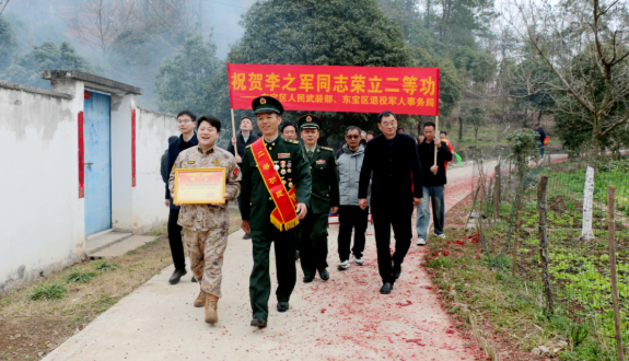 近日,荆门市东宝区仙居乡何家村二组格外热闹。由东宝区人武部、区退役军人事务局、仙居乡人民政府等单位组成的送喜报队伍,敲锣打鼓为荣立二等功的现役军人李之军家庭送去立功喜报和慰问金。