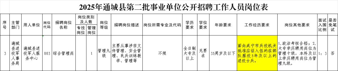 近日,2025年通城县第二批事业单位公开招聘工作人员启动,通城县退役军人事务局面向咸宁市兵役机关批准应征入伍的在部队服役5年及以上的退役士兵招聘1名工作人员,为事业编,欢迎报考!