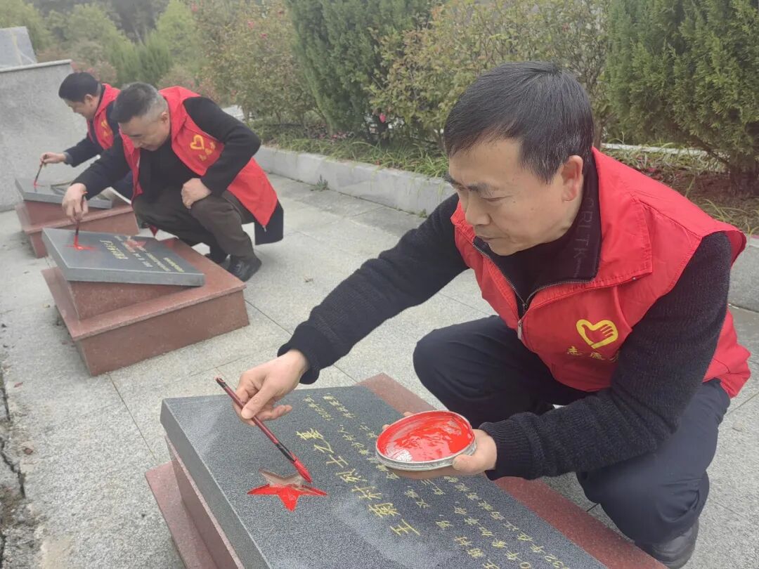 近日,崇阳县退役军人事务局组织党员干部、红星老兵志愿服务队走进崇阳县烈士陵园,开展“我为烈士墓碑描红”活动。活动现场,志愿者们神情肃穆,俯身擦拭碑面浮尘,手持毛笔与红漆,一笔一画为褪色碑文、五角星精心描红。