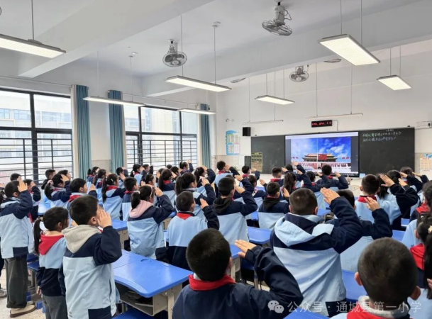 3月30日,通城县第一小学全体学生通过智慧黑板参加“缅怀先烈 弘扬传统”主题升旗仪式,凝望“云端”国旗行队礼、唱国歌。学生代表通过红领巾广播站发表国旗下讲话,号召同学们铭记历史、传承红色基因。该学校将行为习惯与健康习惯养成融入日常,让爱国主义教育在细微处浸润童心。