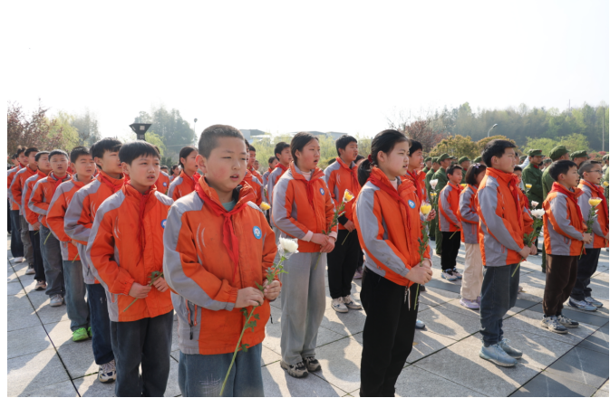随后,少先队员代表迈着整齐的步伐,面向纪念碑献唱《我们是共产主义接班人》,嘹亮的歌声在陵园上空回荡,表达了新时代青少年继承先烈遗志、立志报效祖国的坚定决心。