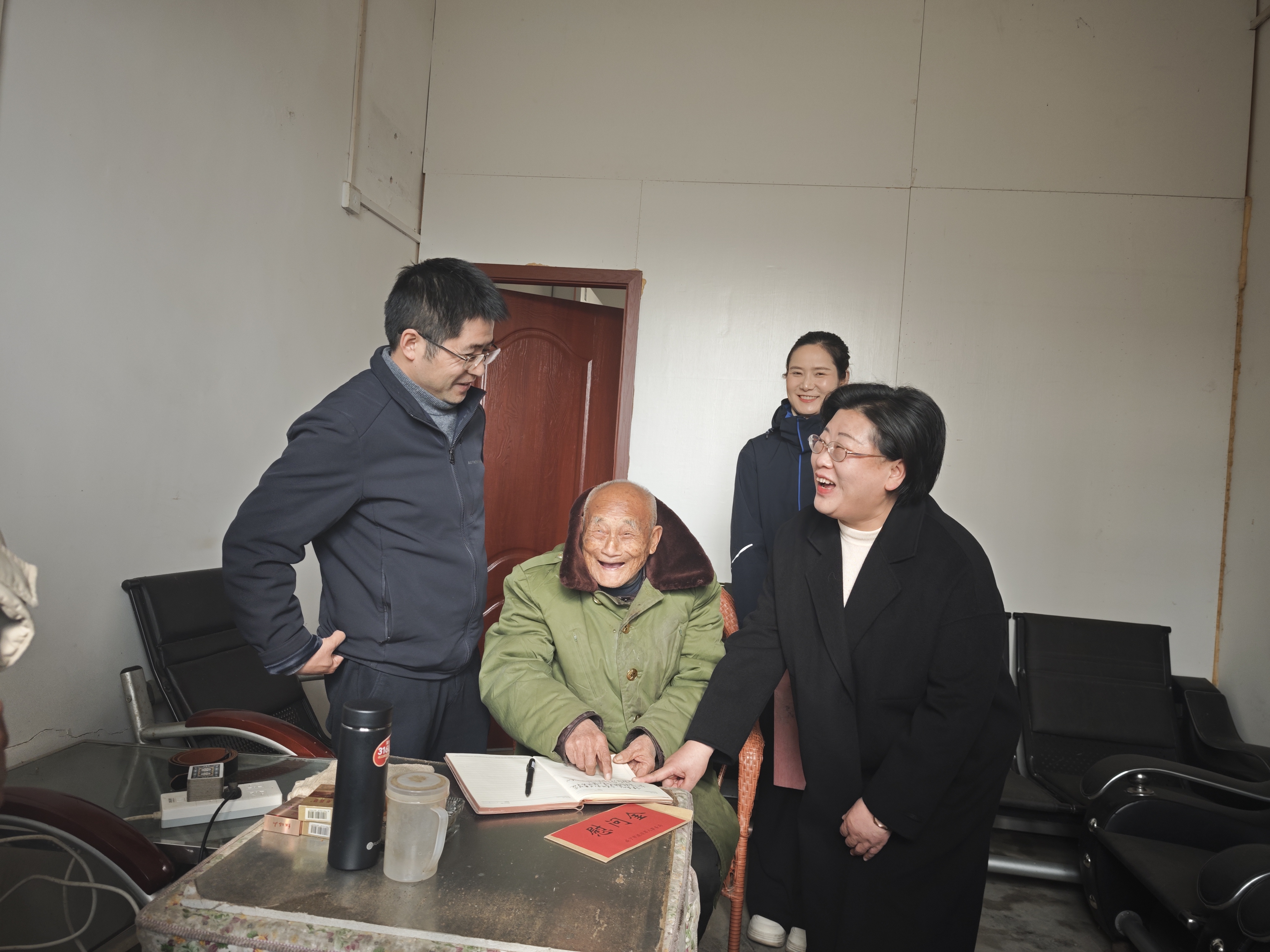 在横沟桥镇长岭村,刘红琳、余丰谦与镇万明亲切交谈,虽然老英雄耳朵听不到,他们用笔将关心关怀写在本子上,感谢他在解放战争和抗美援朝、保家卫国中作出的贡献,向他不忘初心、隐功为民致以崇高的敬意。在新春来临之际,市退役军人事务局、市关爱退役军人协会祝他身体健康、万事如意、福气满满。